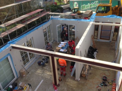 Da man zu diesem Zeitpunkt nicht in der Lage war, die Montagearbeiten einzustellen, musste das Haus ohne Treppe weiter montiert werden.