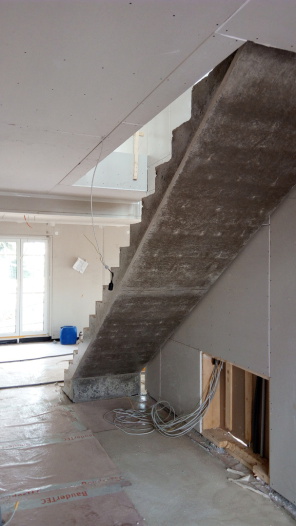 Um nachträglich noch eine Stahlbetontreppe einzubauen, kam selbstverständlich nur eine Ortbetontreppe in Frage. Um den weiteren Baufortschritt nich zu verzögern, war es erforderlich das Bauwerk in einen kleinen Zeitfenster herzustellen. Der Estrichleger stand bereits in den Startlöchern.
